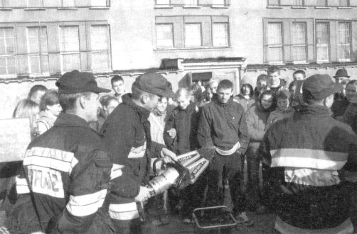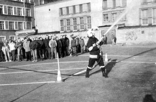 W minioną środę tj. 29 października 2003 roku gościliśmy strażaków z Powiatowej Straży Pożarnej. Strażacy zapoznali uczniów ze swoją pracą. Przedstawili także zasady bezpiecznej ewakuacji z budynku i zastosowania podręcznego sprzętu gaśniczego. Nie obyło się bez prezentacji. Młodzież przez chwilę mogła "posmakować" roli strażaka. Spotkanie odbyło się w ramach lekcji przystosowania do życia w rodzinie. Zorganizowali je: