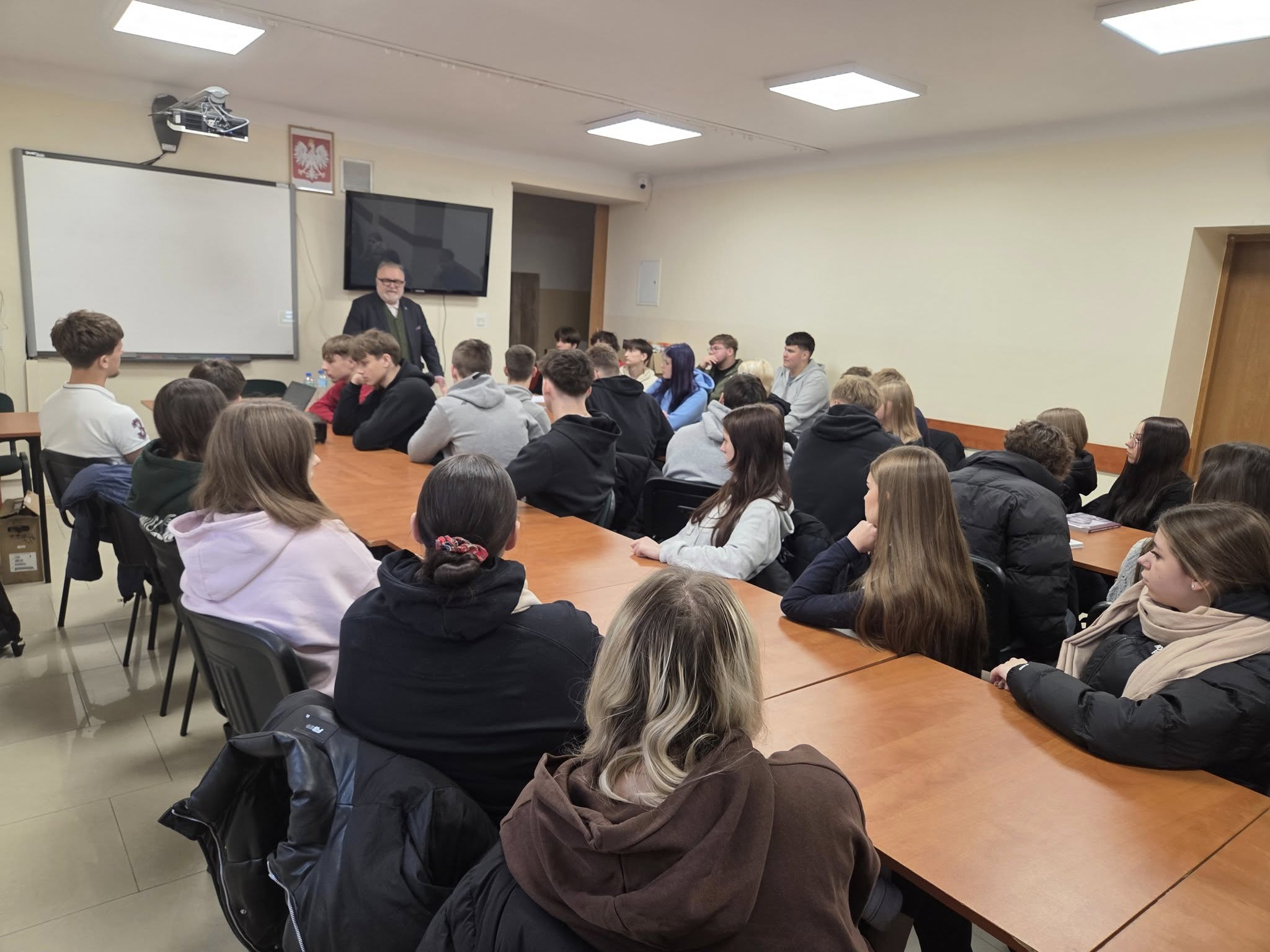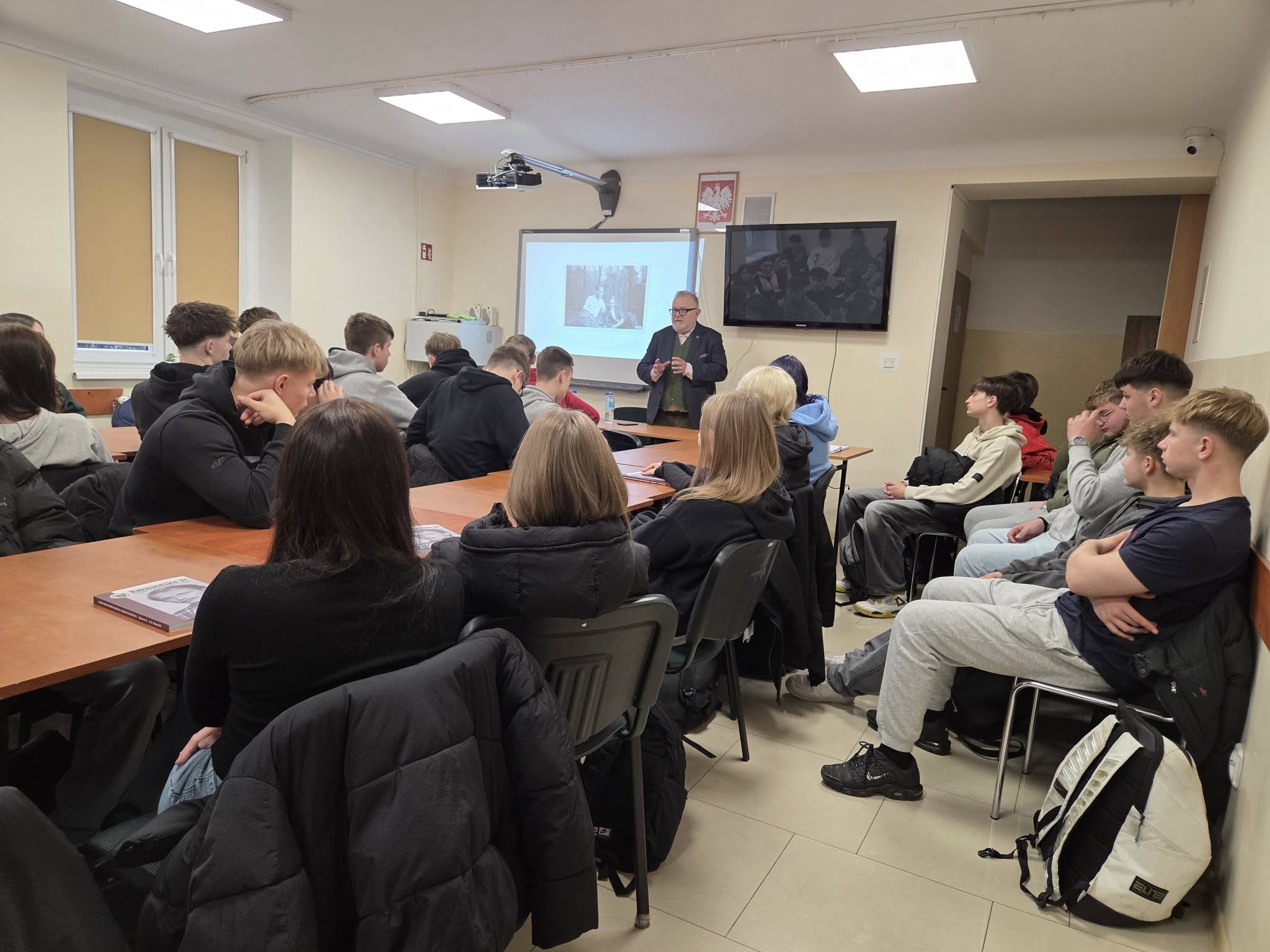 Pan Pawłowicz spotkał się z uczniami klas 4 TI, 4a TOT oraz 3 TE prowadząc niezwykle poruszającą prelekcję pt. „Rotmistrz Witold Pilecki. Oświęcim to była igraszka”