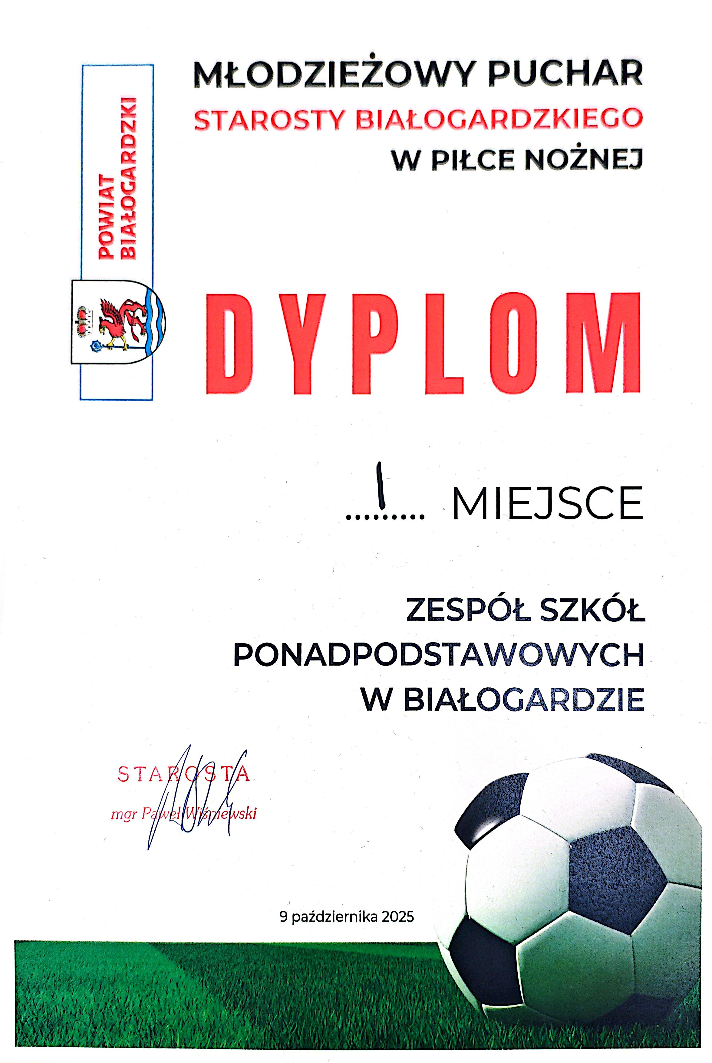 W dniu dzisiejszym czyli 09.10.2025r. na boisku ORLIK prz naszej szkole odbył się Turniej Piłkarski o Młodzieżowy Puchar Starosty. Białogardzkiego.