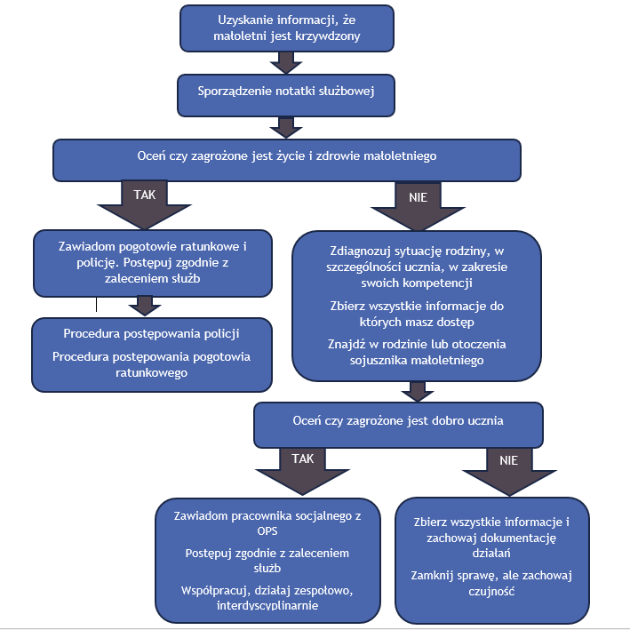- Każdy pracownik szkoły, który zauważył lub podejrzewał u ucznia symptomy krzywdzenia, był zobowiązany do reagowania;